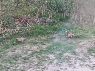 De kommer gående längs vägen. Vi har ännu inte listat ut exakt var de bor, men de delar trädgård med oss. Fru Fasan går först. Med ett värdigt struttande går hon ut på gräsmattan och börjar äta. Herr Fasan går ett par meter bakom henne och tuppar sig. Väl framme på gräset burrar han upp sig och kraxar sitt hesa skri. Fru Fasan ignorerar honom, men det hindrar honom inte från att göra ett till synes ganska desperat parningsförsök. Detta avvisar hon genom att flyga iväg ett par meter och direkt fortsätta beta. Herr Fasan visar sig nu vara smartare än vi anat. Han väljer en ny taktik. Stolt vickar han iväg in under träden, bort från Fru Fasan. Han sätter sig på den lilla stenmuren och burrar upp sig. Detta fungerar. Fru Fasan, som troligen inte uppskattar att bli avvisad kommer strax efter och sätter sig bredvid honom på muren. Vi antar att den numera svårfångade Herr Fasan får till det, men vi låter dem vara ifred för stunden. Om vi inte hade katter hade de kanske kunnat bilda familj. Det är hursomhelst mysigt att ha dem här.