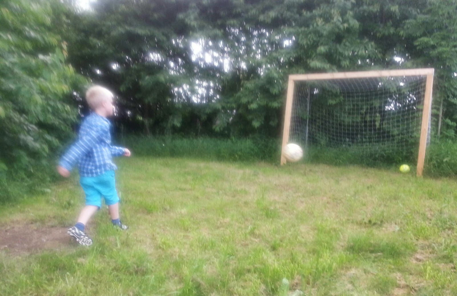Efter en kort promenad genom djungeln hittade vi fram till fotbollsmålet. Nu tränar Ville skott medan jag sippar på ett glas Mandala och lyssnar på näktergalen som sitter i flädern strax bakom mig. Livsglädje.