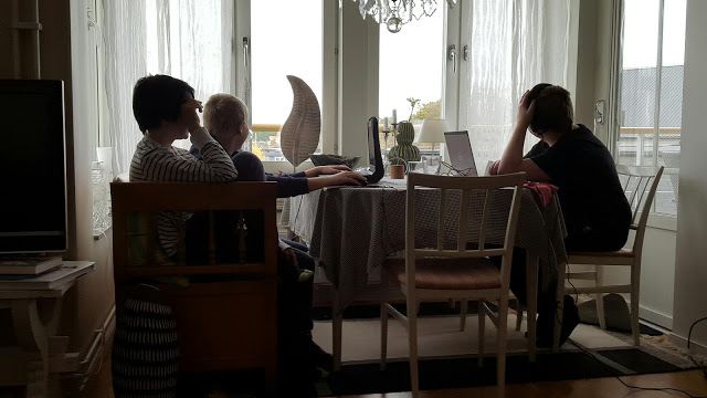 Den planerade turen till simhallen sköts upp och i stället gick vi till lokalen där pappa ställer ut akvareller i helgen. Sedan promenerade vi till stan och pappa köpte lunch till oss. Vidare hem för att äta smarrig räksallad och Subway-baguetter.