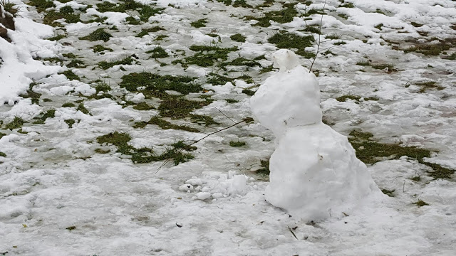 I söndags gjorde Ville och jag en tvehövdad snögubbe. I dag har hen bara lite av det ena huvudet kvar och gräsmattan ser ut som skånsk vinter igen.