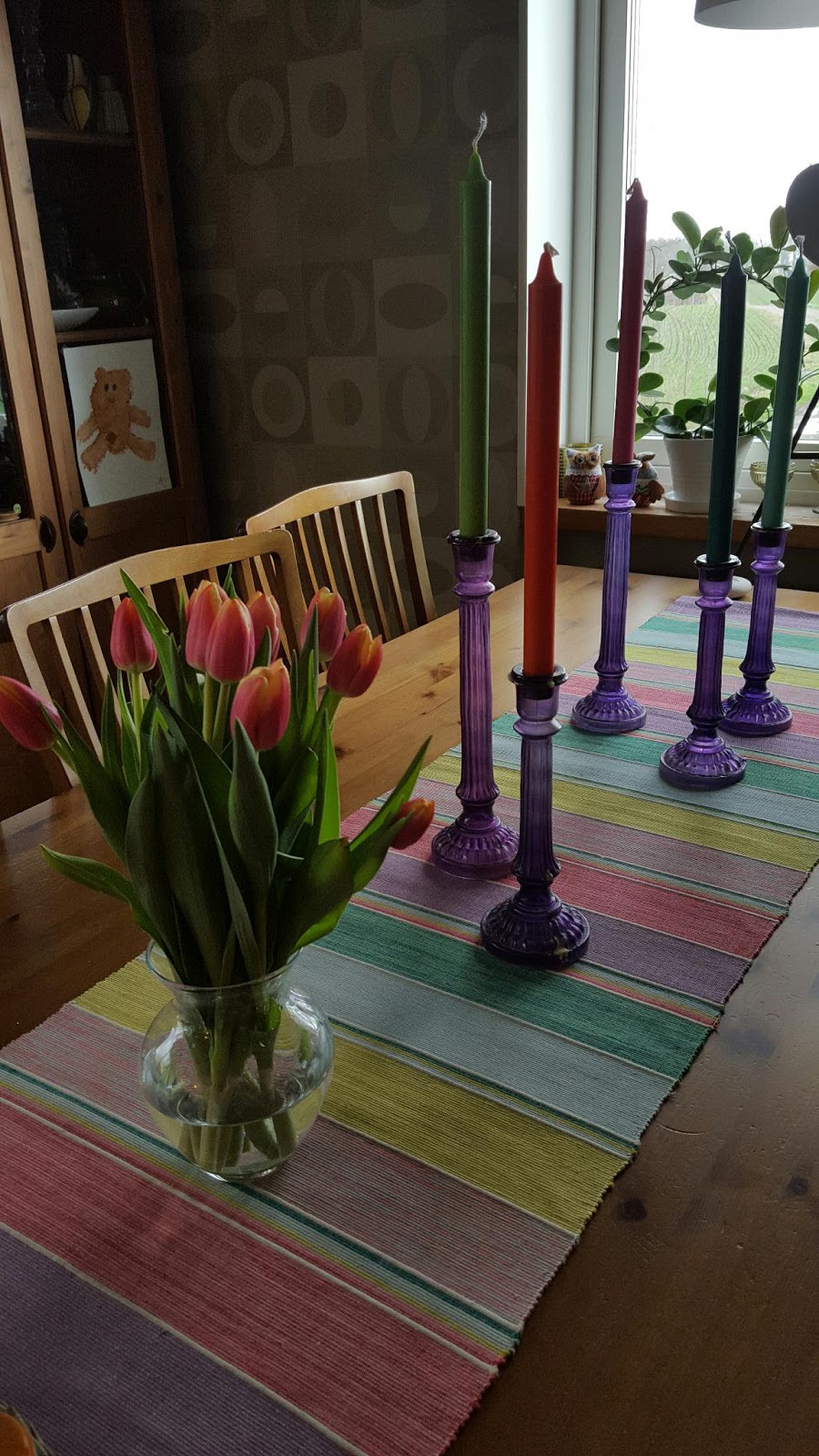 Efter fyra (!) veckor var det dags att kompostera nejlikorna som vi hade i gröna flaskor på köksbordet. Lite nya ljus och tulpaner till den ”gamla” duken och de ”gamla” ljusstakarna och köket är finfint igen.