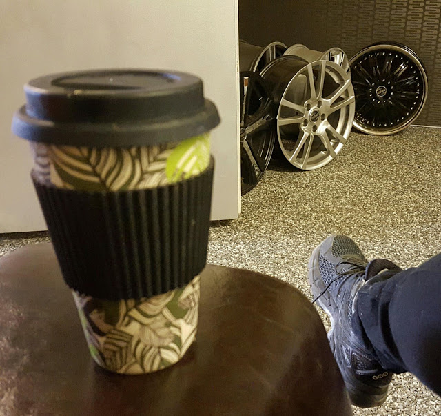 Kalle och jag chillar uttråkat. Eget kaffe är godare än automatens och det är skönare att ha lite tråkigt än att byta hjul i regn på lerig gårdsplan. Tjo!