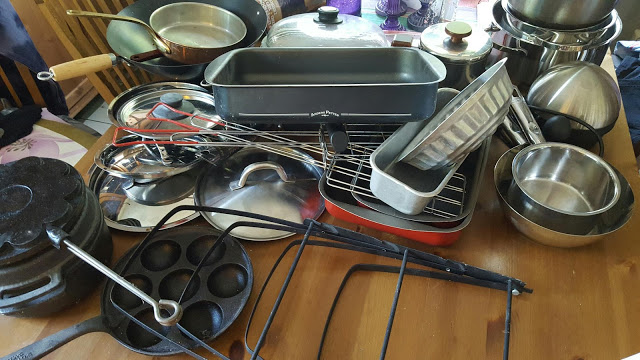 …och den kan komma tidigast i morgon så vi förbereder köket. Sten har tömt glas- och metallåtervinningsskåpet samt kastrullskåpet. På bilden är det som ska rengöras och ställas tillbaka när maskinen är på plats. Resten (många kassar…) ska till återvinningen. Heja Sten!