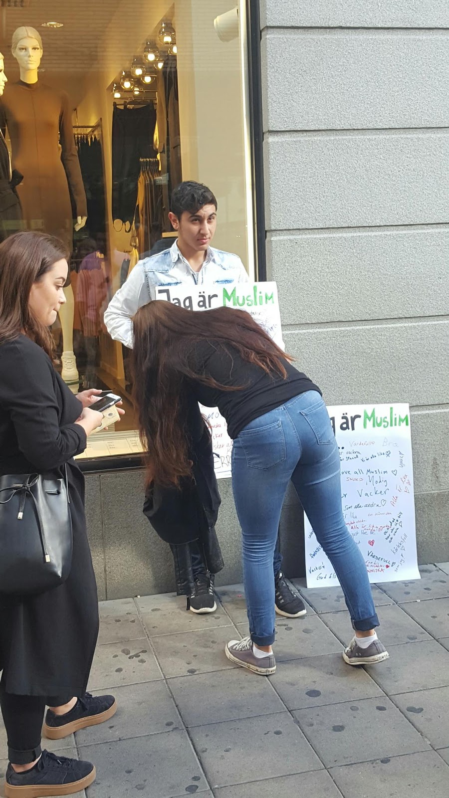 Tänk att man måste vara modig för att skylta med sin religiösa tillhörighet. Men så är det nog i Stockholm i dag. Vi var många som stannade och skrev på deras skyltar men många fler var de som gick förbi. En kvinna stoppade mig med frågan ”Varför står de så där? Ska jag också behöva stå upp för min religion?” Jag svarade ”Ja. Det tycker jag att du ska. Känn hur det känns.”
