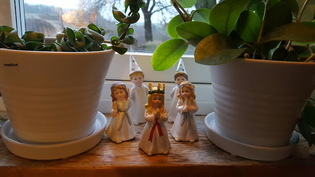 Just i år ser vårt lilla fönstertåg väldigt blekt och trist ut. Jag hoppas att det luciatåg du möter i dag har fler olikheter.