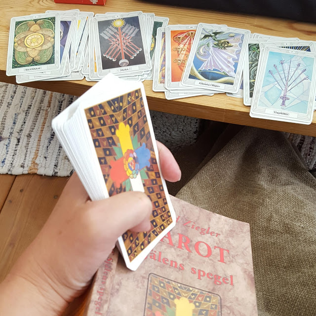 Jag har en svaghet för vackra kort och symbolik. Tarot lockade starkt i min ungdom men då var jag alldeles för präktig. Den här leken köpte jag förra sommaren, boken i vintras. Dags att ta tag i det nu. Ett sant nöje.