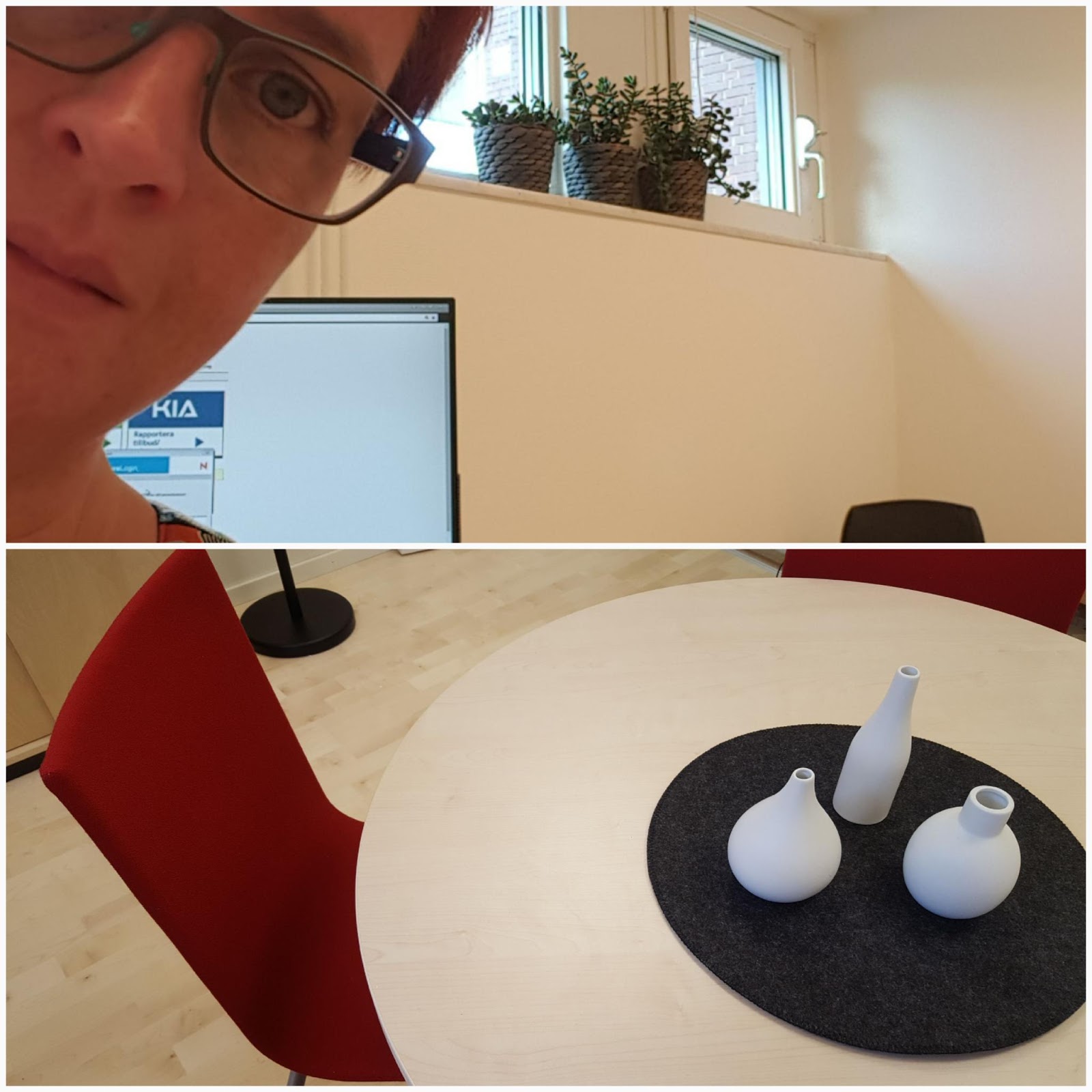 Så rena linjer som möjligt. Vitt, svart och skönt röd. Bästa ståmattan och ny, fin datorskärm. Ja. Jag trivs i vårt lilla arbetsrum. I morgon har vi invigning. Vi hoppas på fler besök än på Lucia…