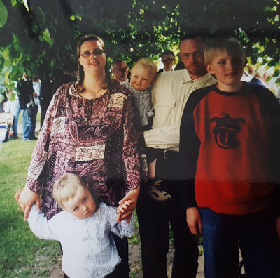 Familjen på bilden är på studentuppvaktning och består av en nästan helt rakad Sten, hans som Tobias som bodde hos oss vid den tiden, en Lina med vidhängande gravid- och ammandekilon, flätor och Bismarck i guld, liten Olle tryggt på pappas höft och orolig Kalle med mammas händer i sina.