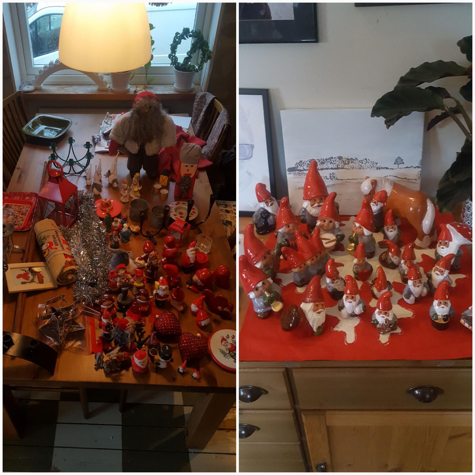 Dags för tomtarna att vila. Huset är nystädat och inväntar morgondagens glittersilver. Jag får en stor kaneldoftande cappuccino som belöning. Killarna en stunds lugn och ro i sina rum. Sten sorterar papper. Mot rutan – regn.