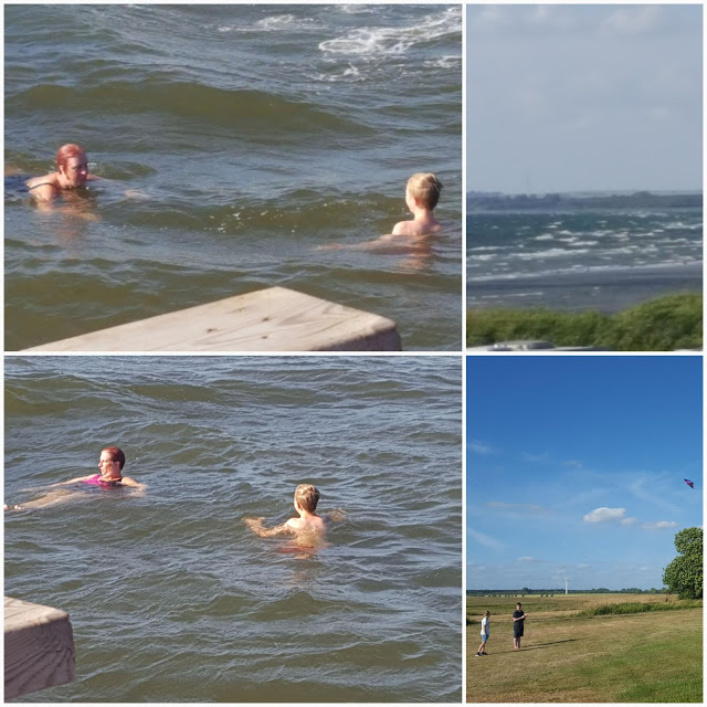 Det är alldeles för blåsigt för att jag ska kunna sova här men vagn och tält behövde tittas till. Så jag packade Kalle och Ville i bilen efter jobbet och körde hit. Nu har vi badat i fantastiska vågor, ätit kvällsmat och flugit drake. Linor och spännband är kollade och en och annan pinne ibankad. Vi styr hemåt igen och jag kör hit efter jobbet i morgon.