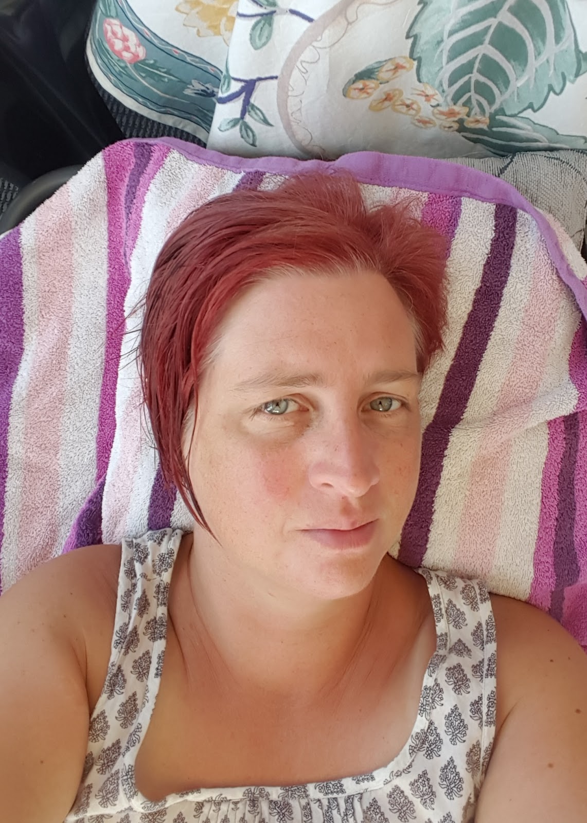 Nyss kallduschad och skönt sval. På en solsäng i ett förtält. Sommarljuden fyller luften. Lekande barn på strand och i vatten. Blåst i tältduken. Deckare från telefonen.