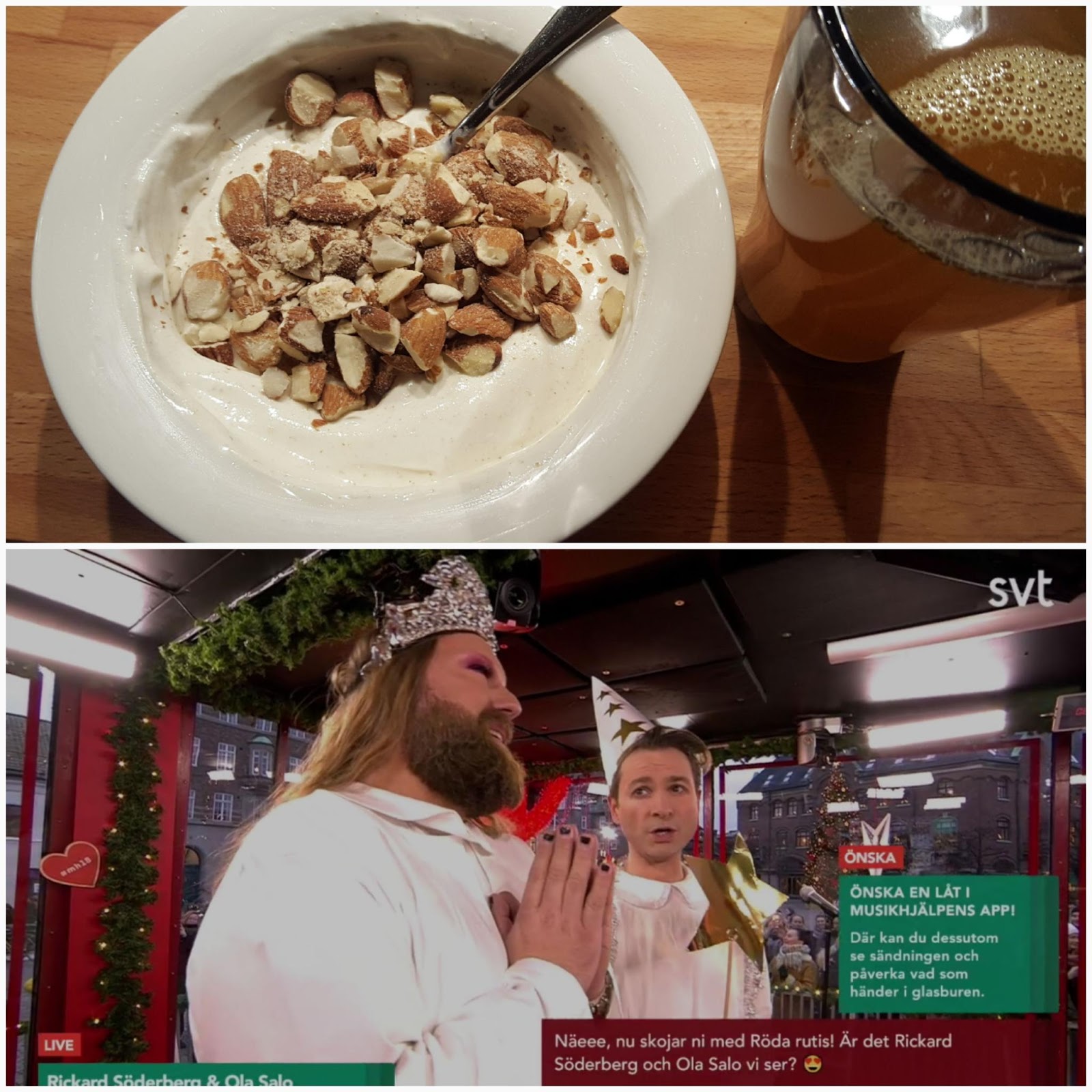 Idag skulle jag till förskolan för första gången på länge. Men icke. Här ligger jag i sängen med ingefära och mandel, Richard Söderberg och Ola Salo. O, helga natt-rysningar.