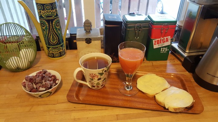 Frukost ett uppäten. När en inte äter bröd så ofta är det galet gott med rostat surdegsbröd och gräddost. Med blodapelsinjuce och earl grey till. Mm Mm.