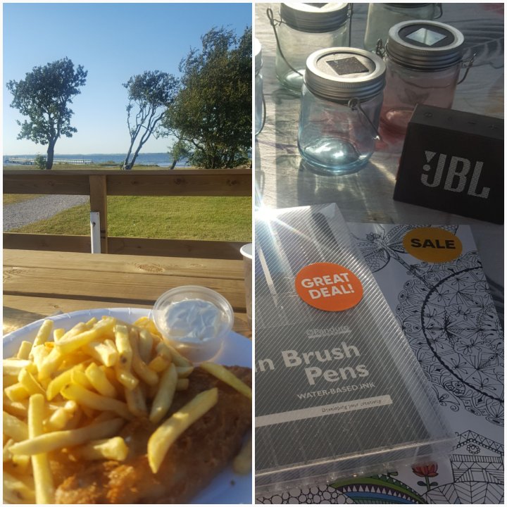 Då köpte jag lite pennor, en målarbok och en flaska vin.