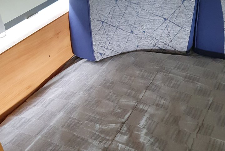 För en femhundring fick vi en skön bäddmadrass och ett riktigt bra överkast. Nu kan vi sitta ännu skönare i ”soffan” (det som egentligen är en säng eller matbord och smala soffor). Dessutom minskar slitaget på husvagnen originaldynor.