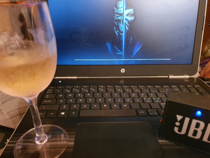 Nu har jag landat i ensamhet. Ett glas vitt, lite spel, en podd.