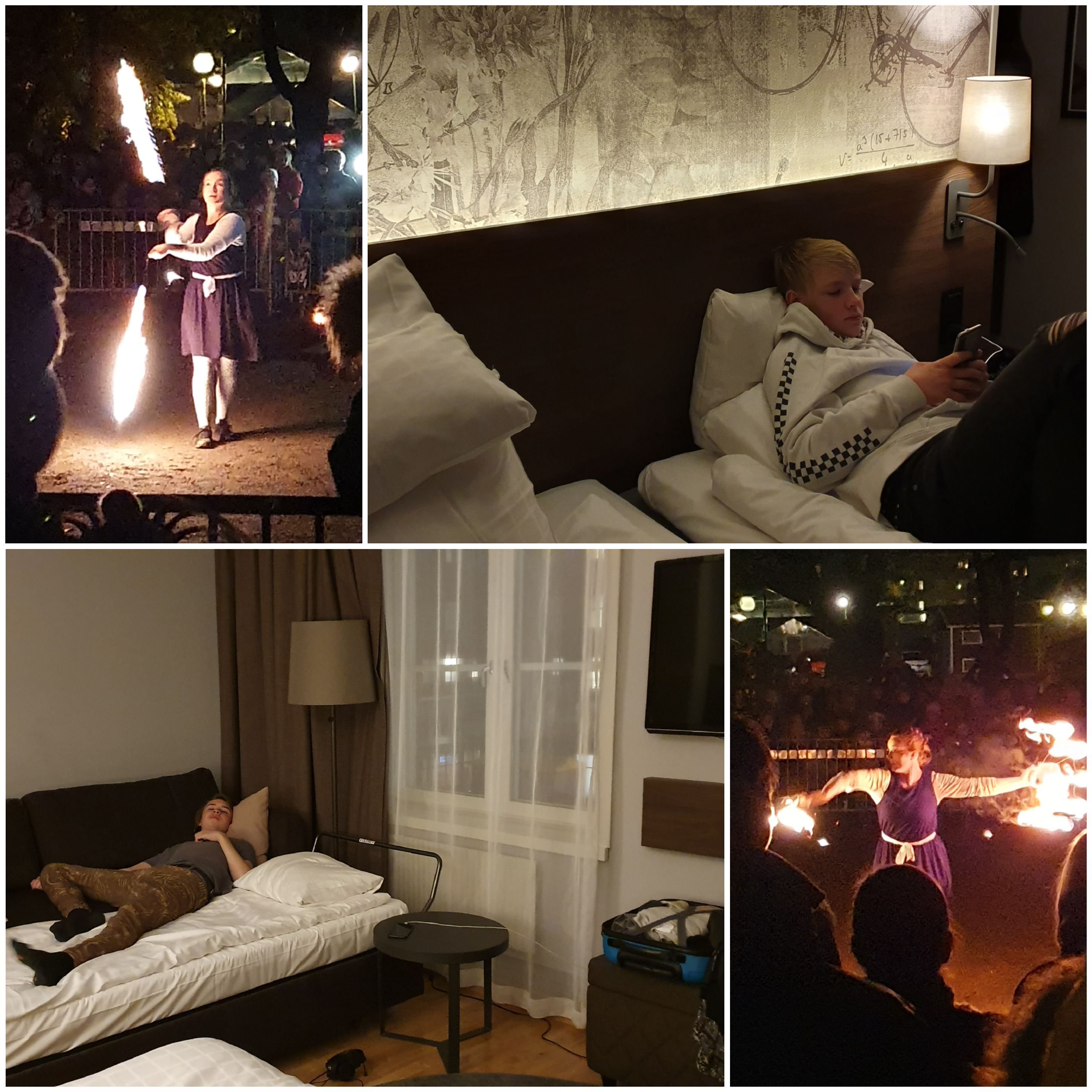 Nu har vi landat i hotellrummet efter några timmar hos mormor och Håkan, lite mer resande, en gratis våffla och en eldshow i Trädgårdsföreningen, mat på BK och skön promenad till Frimis. Nu njuter vi stillhet framför Bytt är bytt. Gott liv.