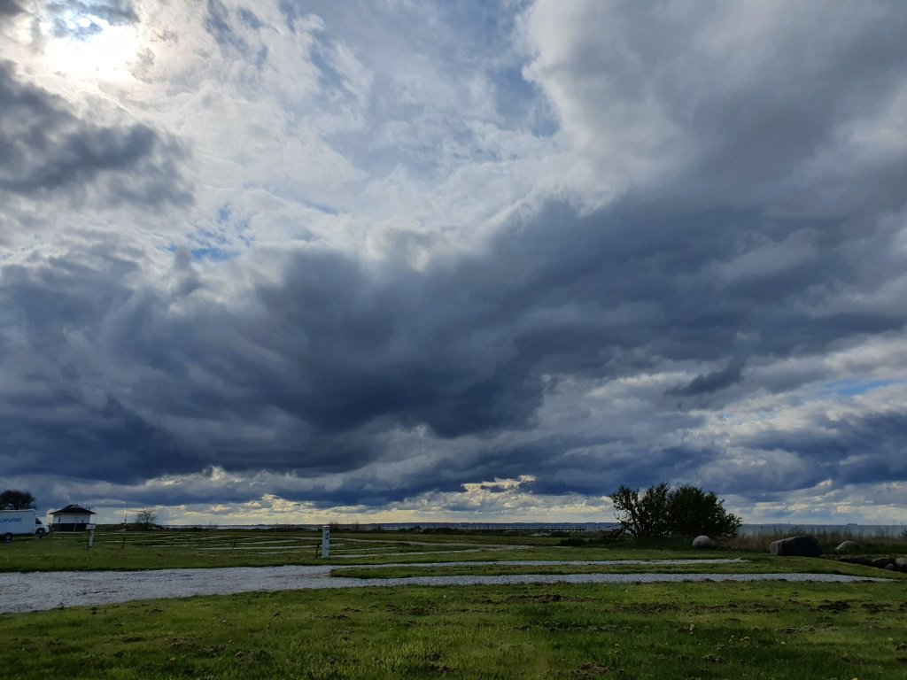 Nu är kroppen ljuvligt skön och jag lutar mig mot husvagnen, sippar vitt vin med is och tittar på molnen som rullar in.