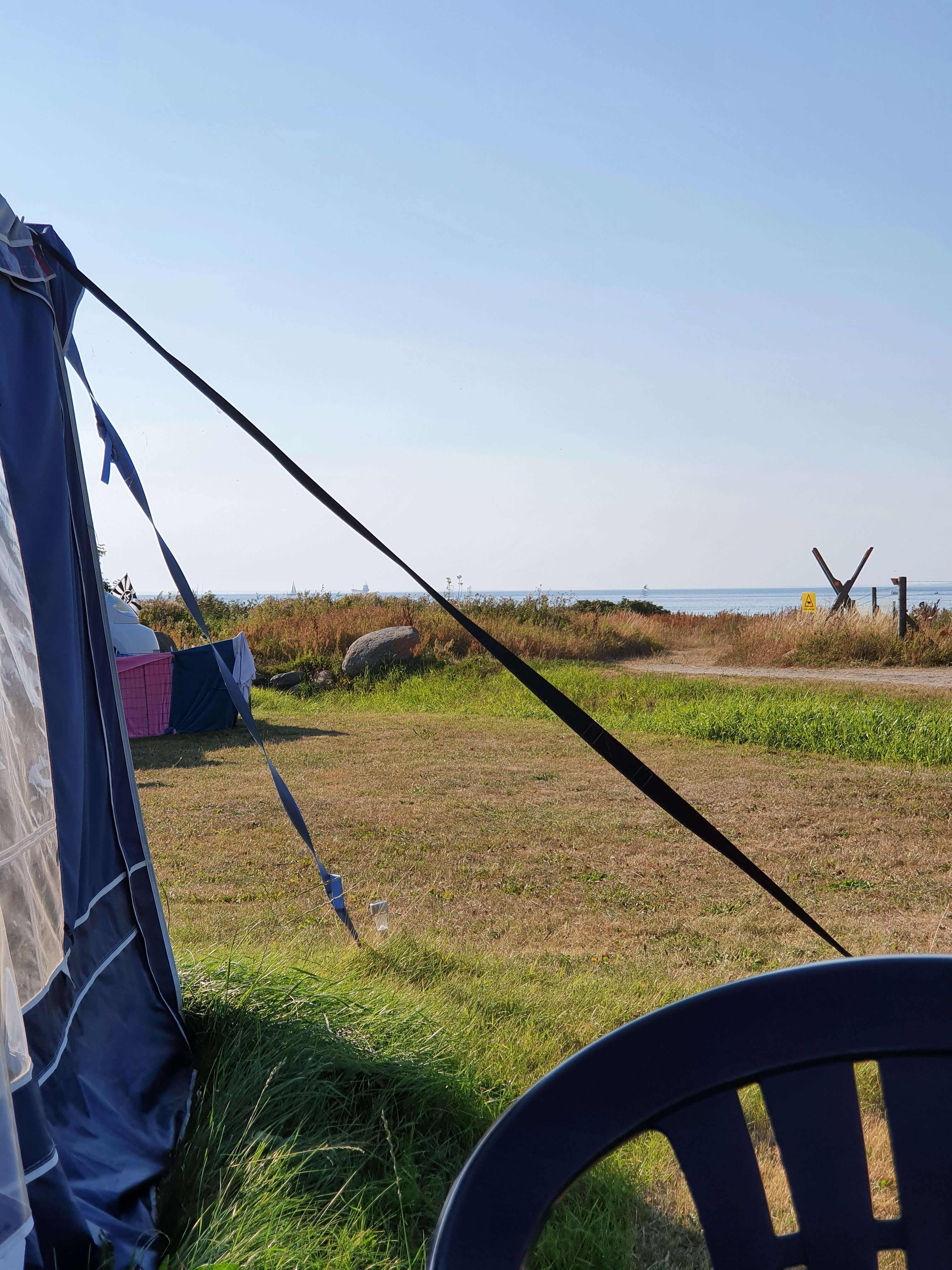 Helt vindstilla och 30 grader varmt. Att bada är lönlöst om syftet är att svalka sig. Förtältet släpper in kvällssol och min ångest stiger med värmegraderna.