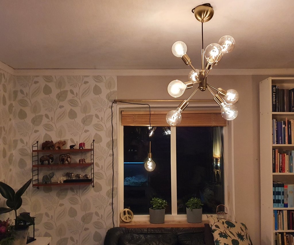 Hela familjen, hela dagen. Bad i havet, god mat och fina presenter. Sten har ordnat en talgbollshållare som vi kan se från soffan. Och så köpte jag nya lampor till vardagsrummet med hans betalkort.