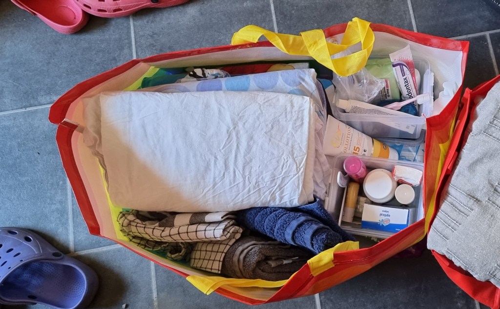 I hallen står första packningen i väntan på ny ork. Lakan, handdukar, filtar, hygienprodukter och en ny äggkokare.