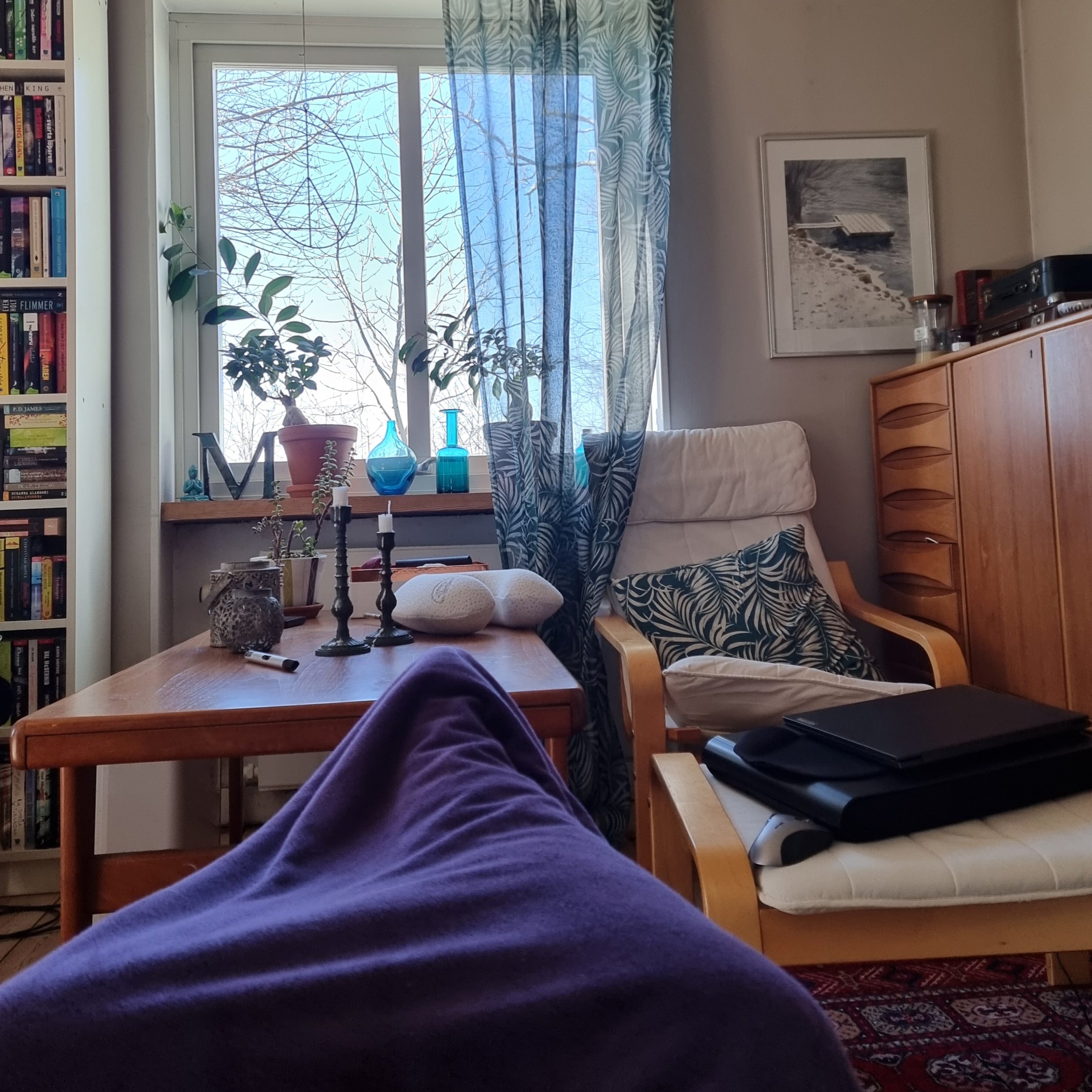 En halvtimme på rygg på golvet med fötterna på en pall. Sedan en halvtimme med valfri aktivitet. Det kan vara att linka fram med hjälp av gåstavar, äta frukost stående, laga mat eller halvligga framför jobbdatorn eller TV:n. Efter det en ny paus på golvet och så rullar dagarna på.