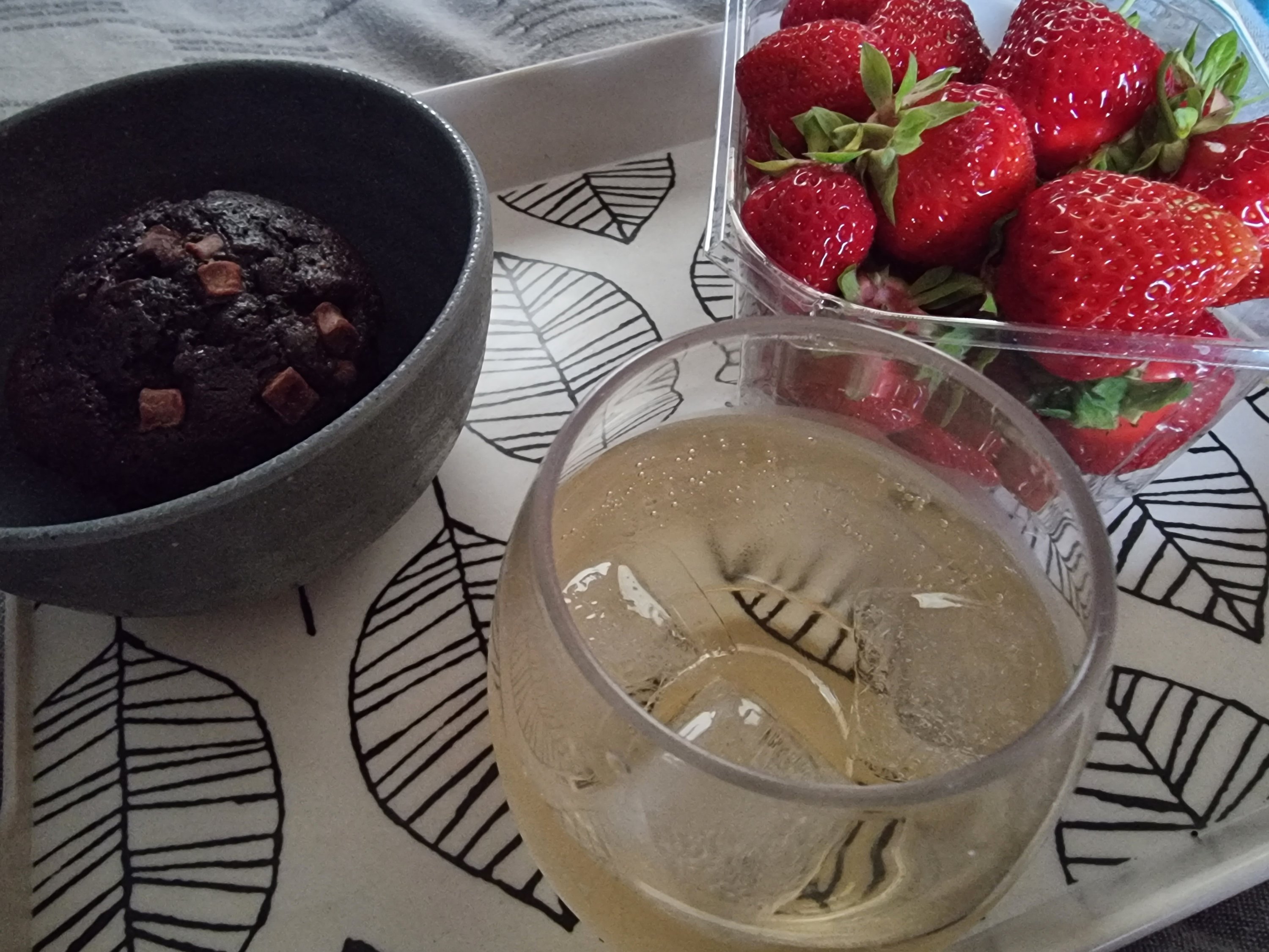 Jordgubbar, en chokladmuffins och ett glas vin.